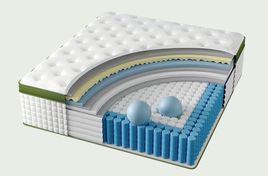 Our mattress uses hundreds of individually wrapped pocket springs, each operating independently to support seven key body zones — feet, legs, hips, waist, shoulders, neck, and head.